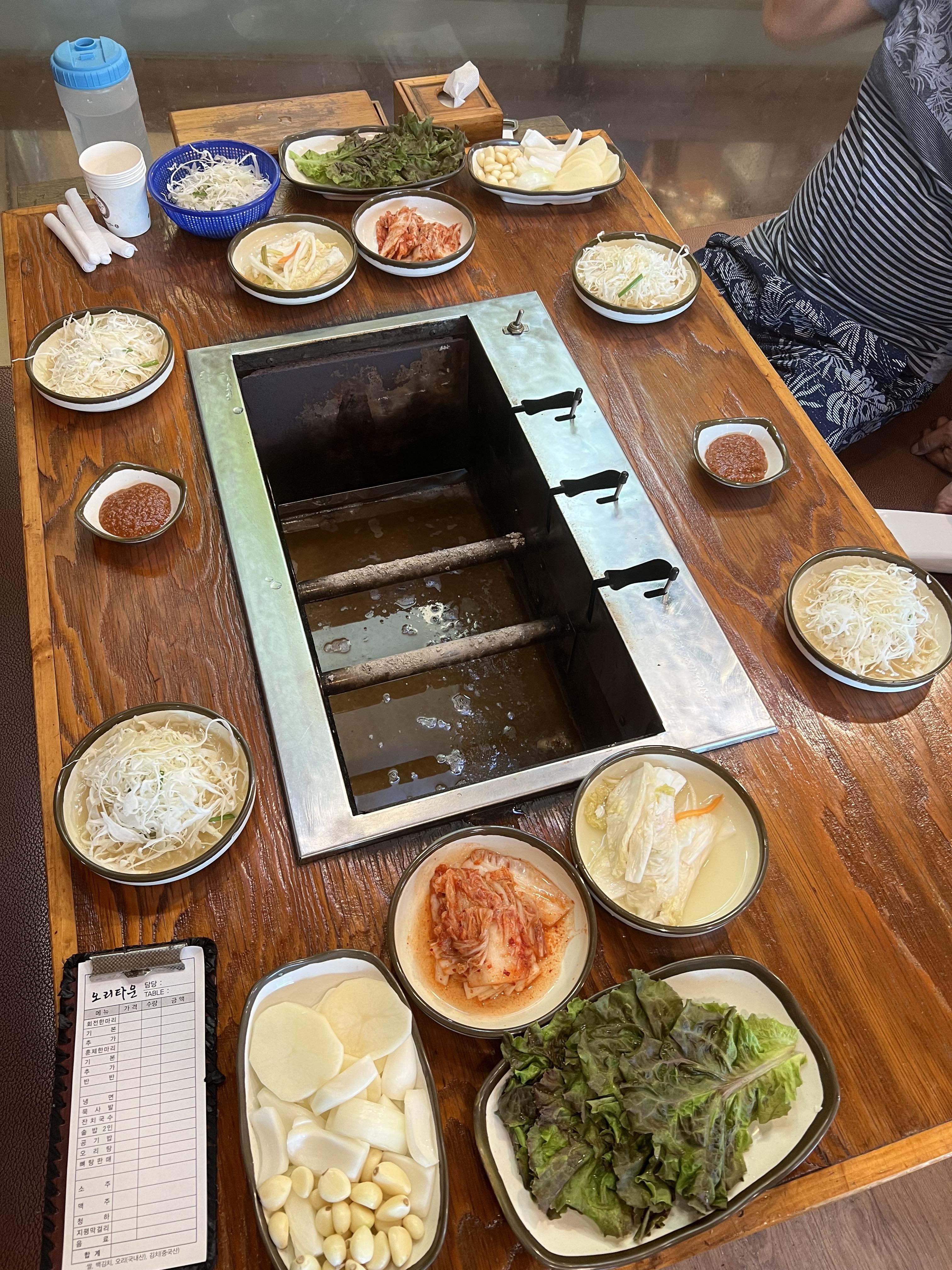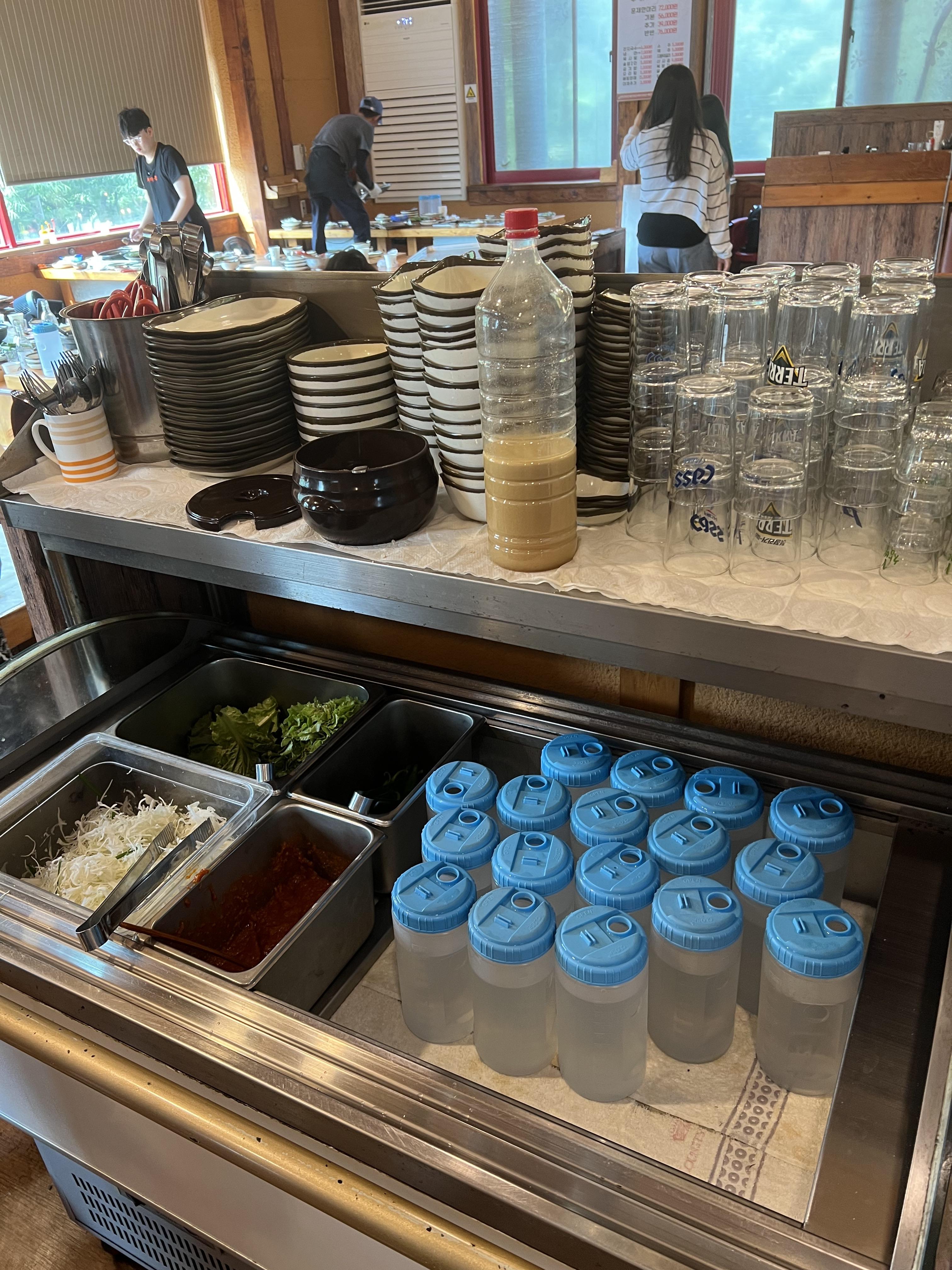 기본 찬으로는 상추, 김치, 백김치, 야채 등등 세팅이 됩니다. 기본 찬이 부족하실 경우에는 셀프바에서 이용 가능하세요!