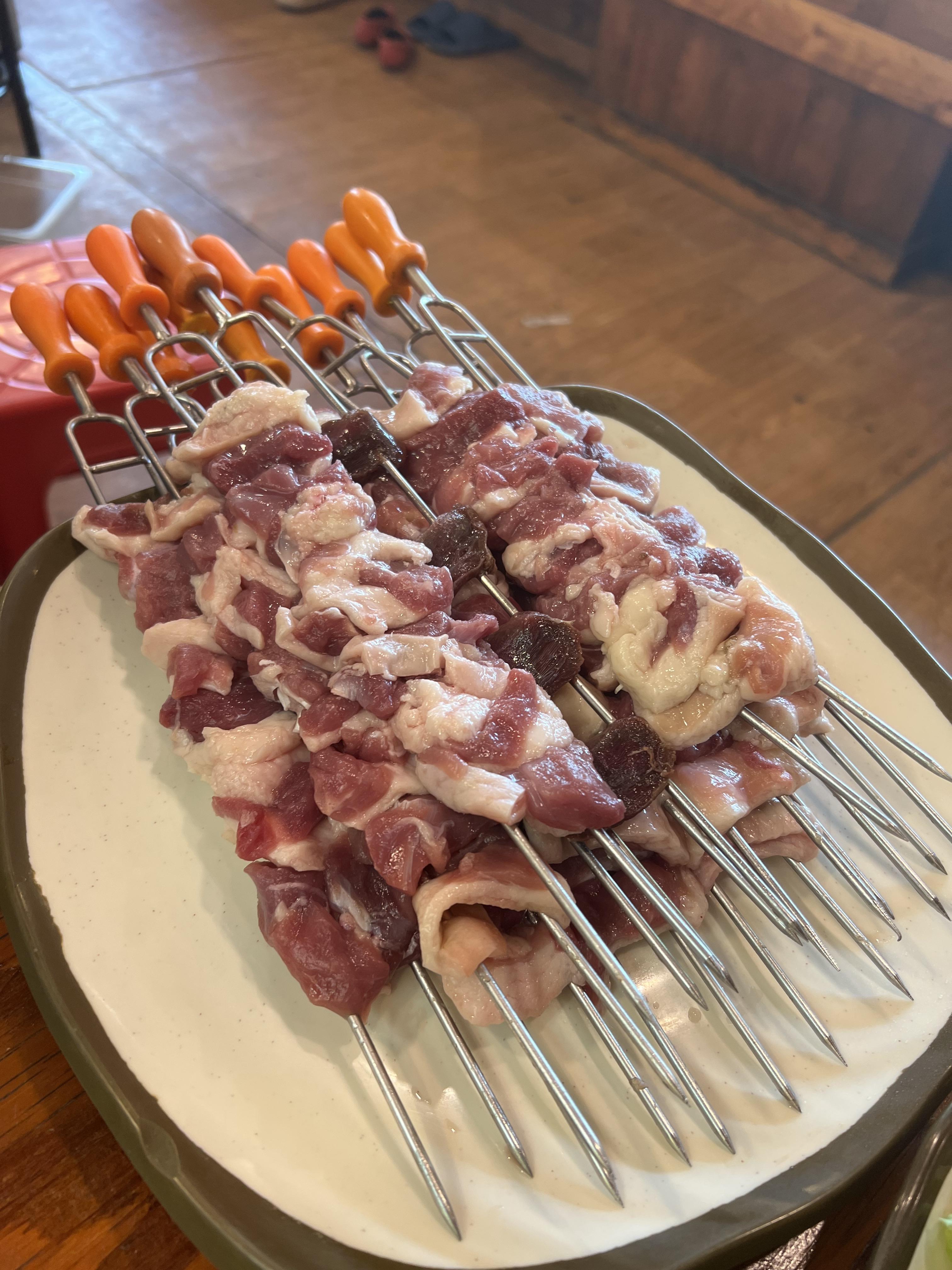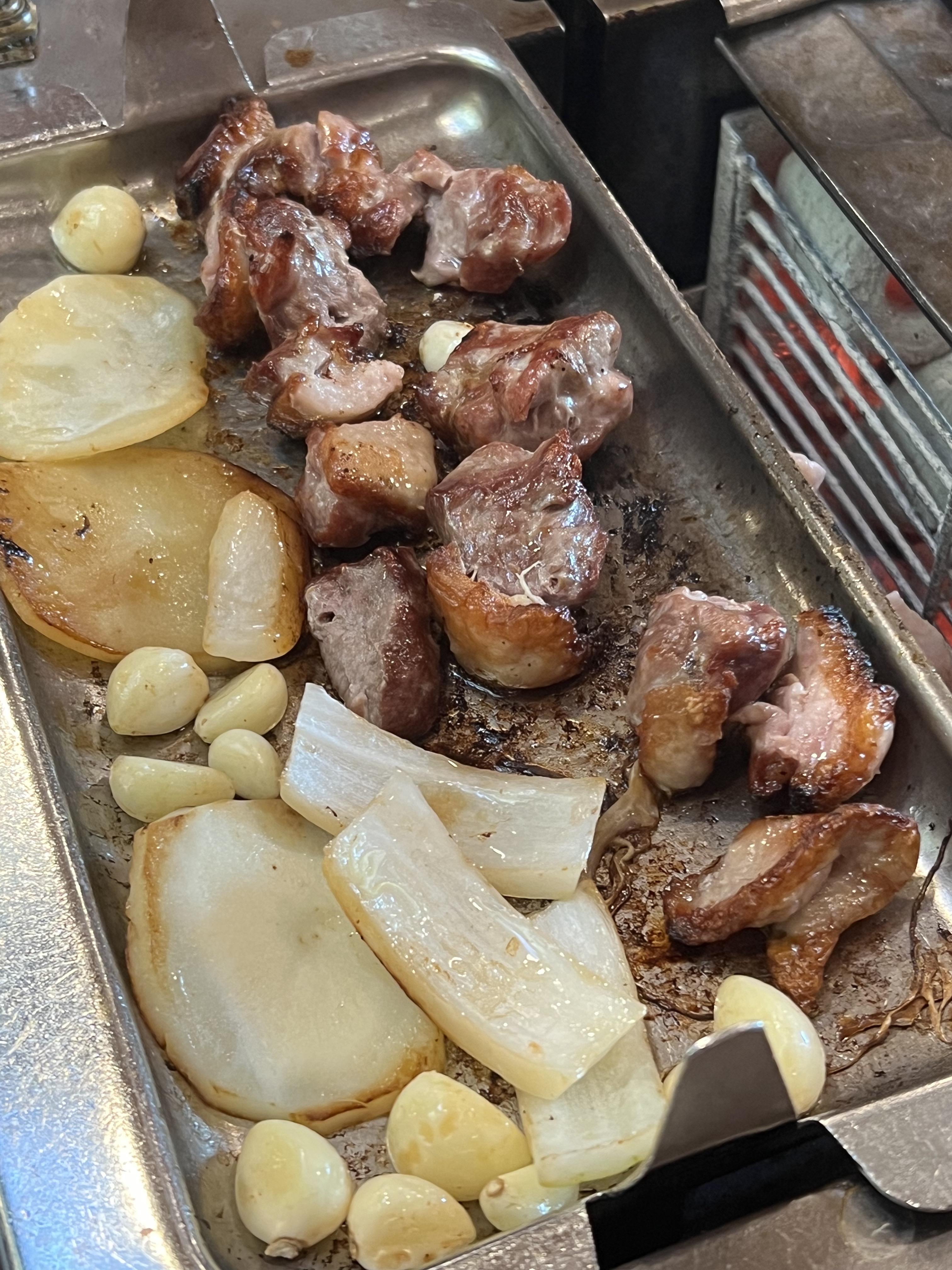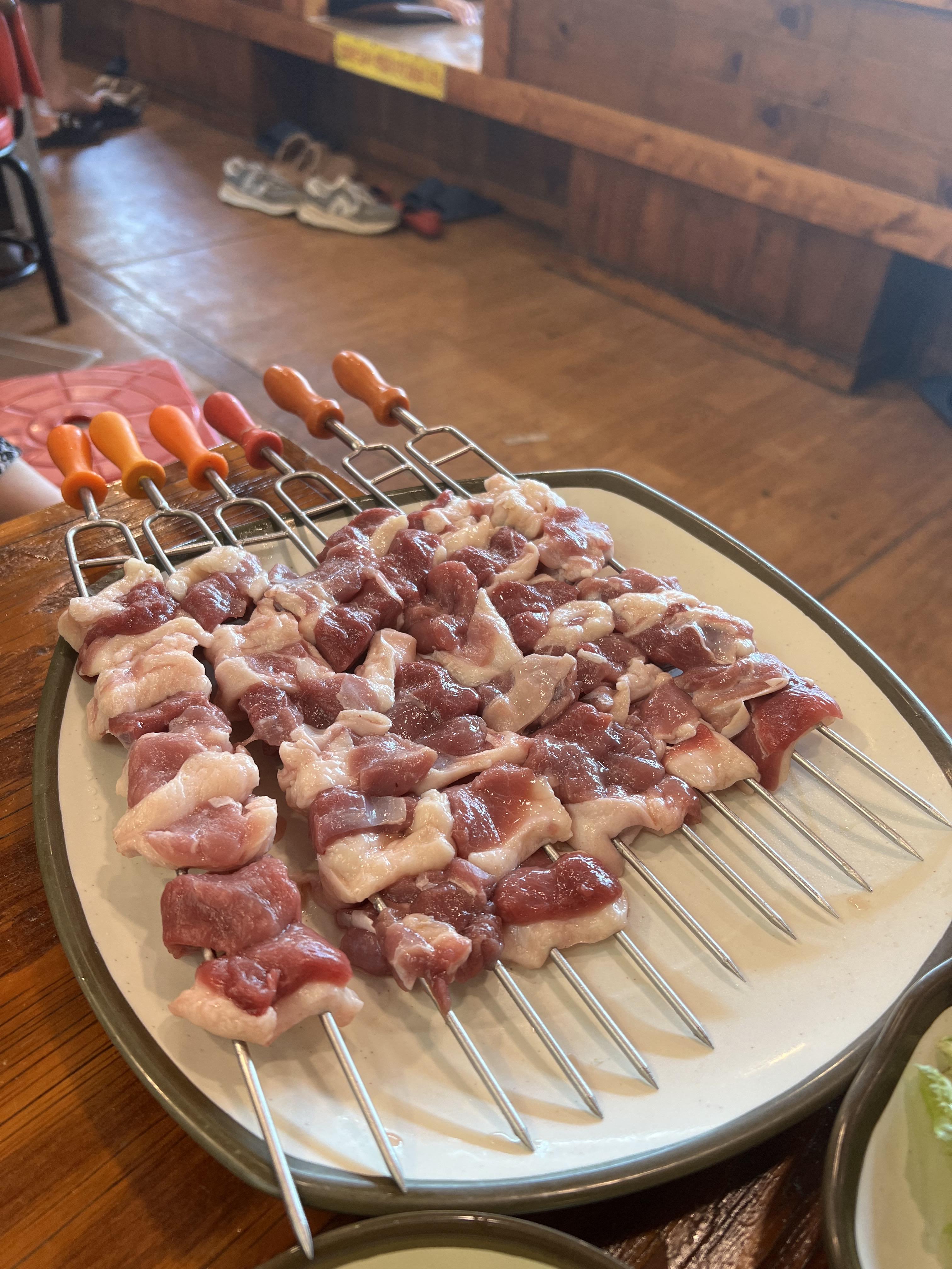 숯불이 들어오고 고기가 나오는데 너무 신선하고 고기도 커요~ 오리고기와 함께 염통도 같이 나옵니다.