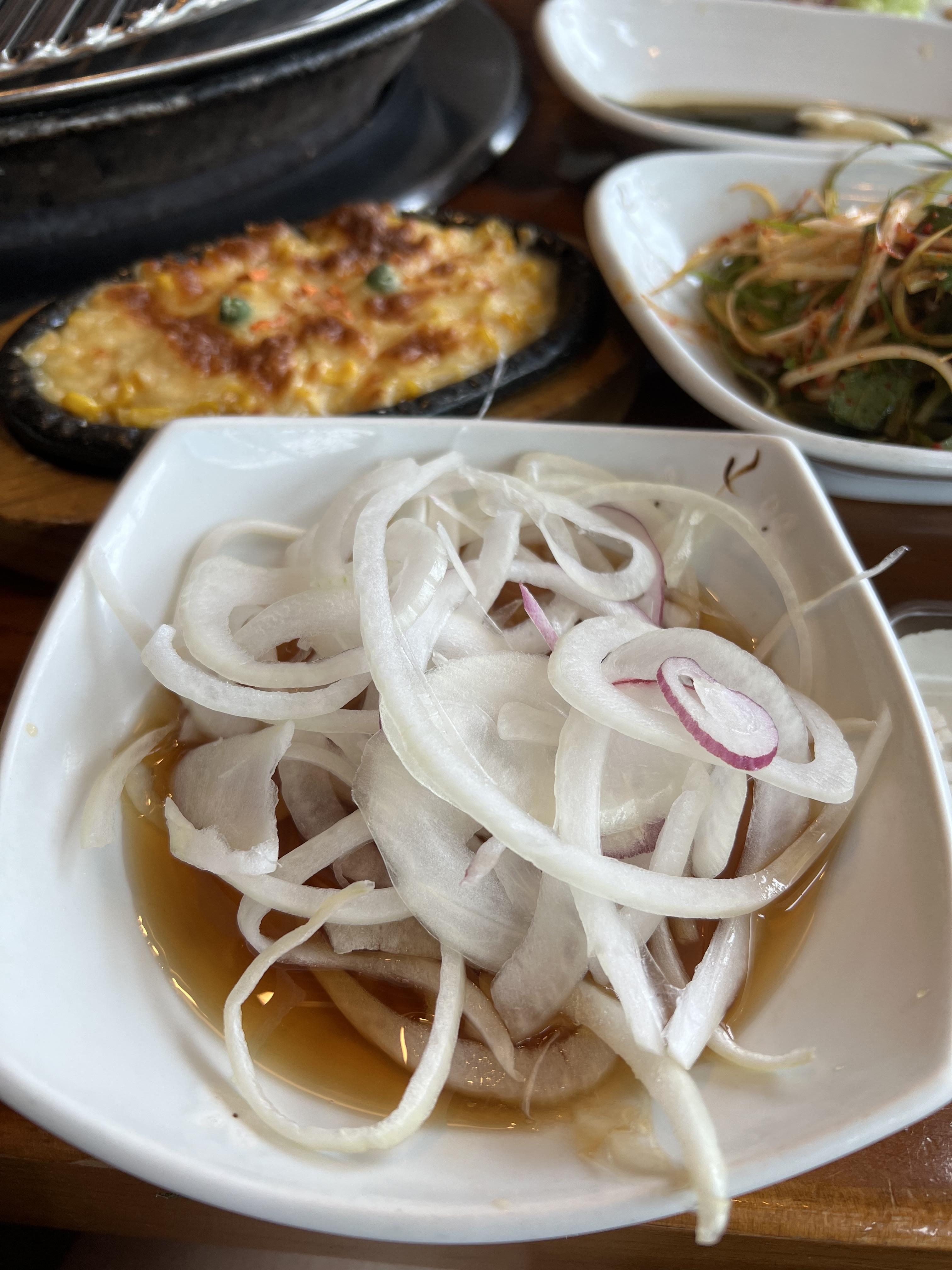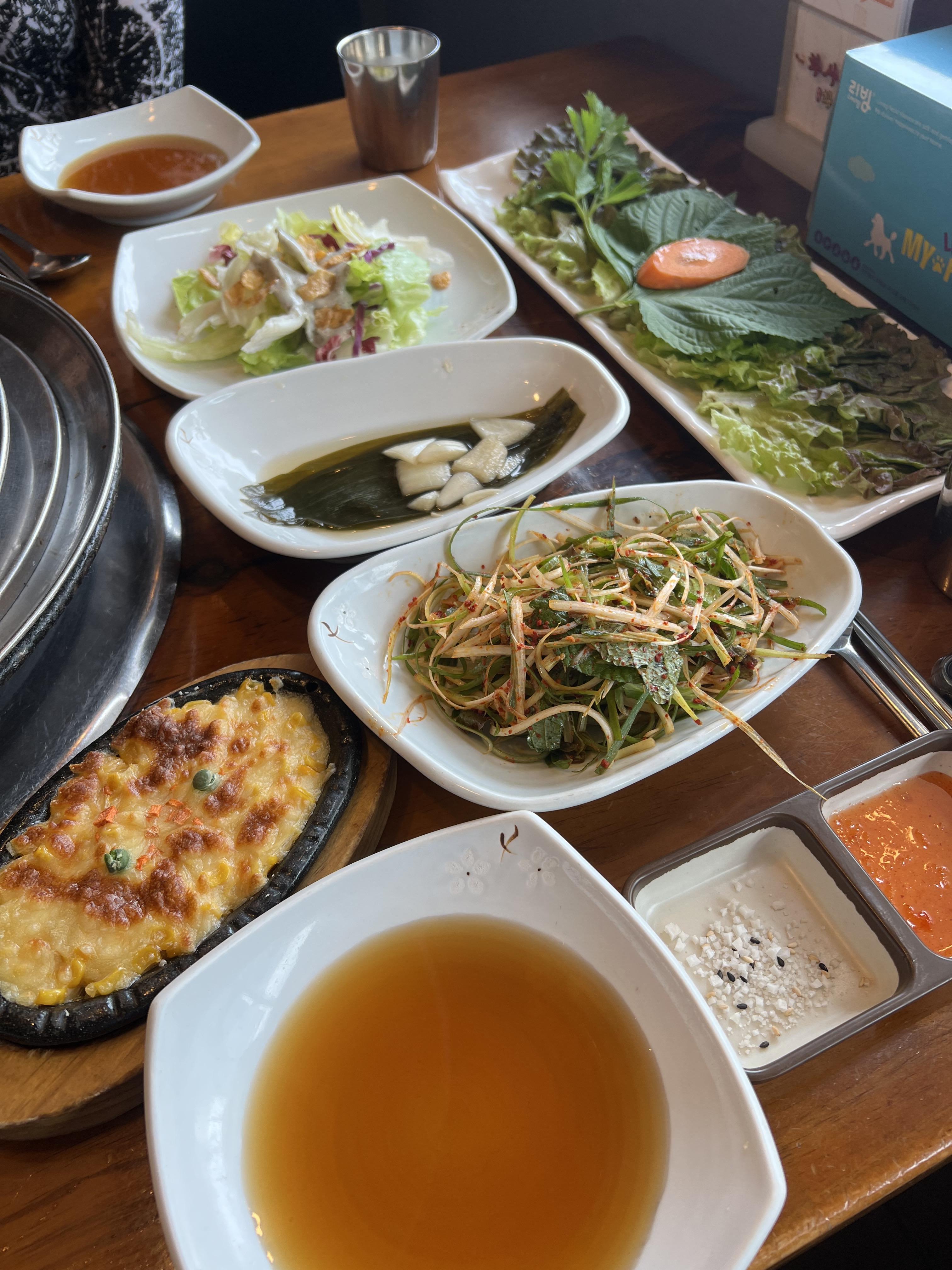 밑반찬으로는 콘치즈, 파채, 동치미, 샐러드, 각종 쌈채소, 명이나물, 도토리묵 등등 아주 푸짐하게 한상을 차려주십니다!
