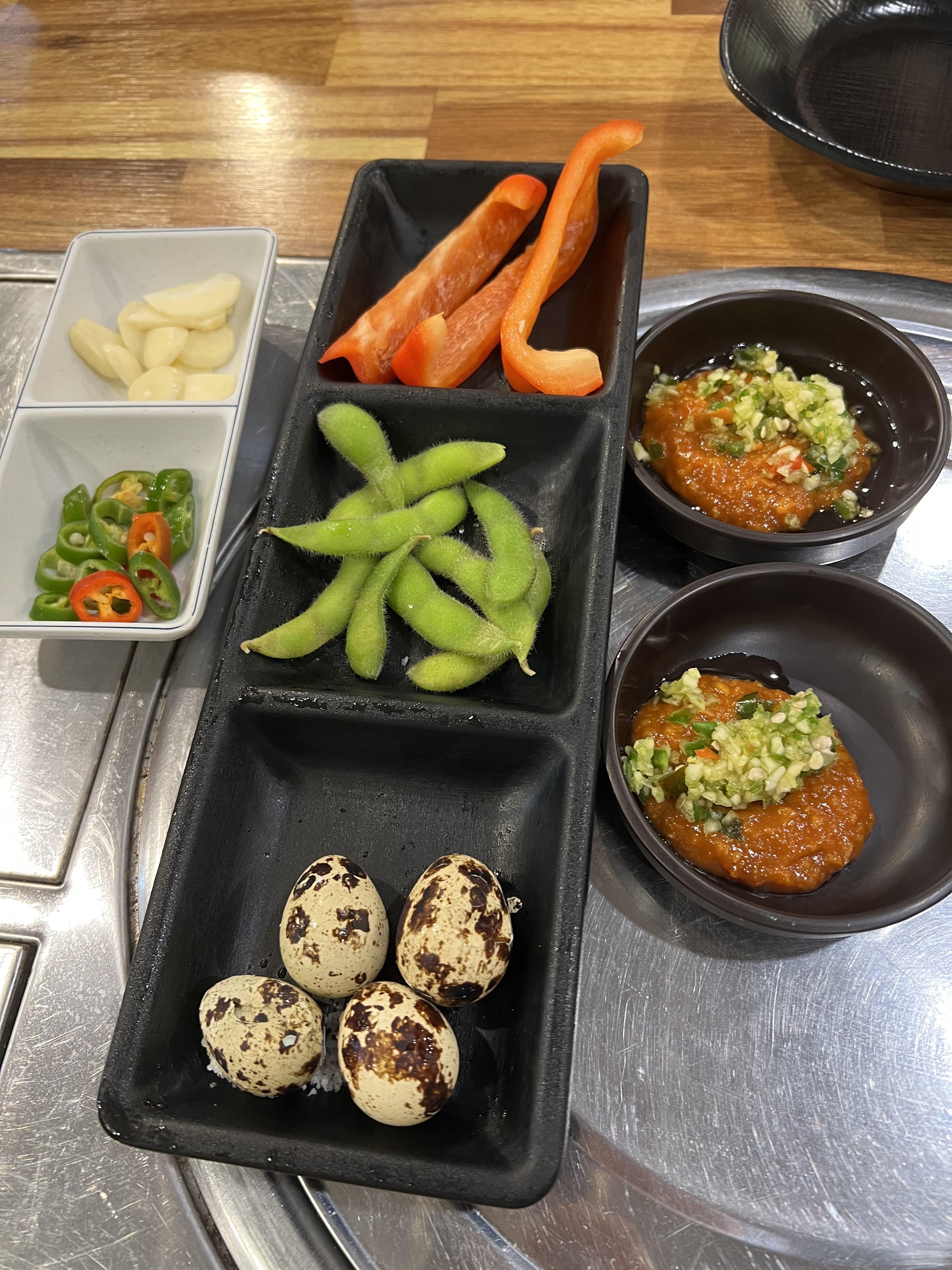 기본 반찬으로는 메추리알과 완두콩 파프리카가 나왔고 마늘과 고추, 미역국 등등 나왔어요.