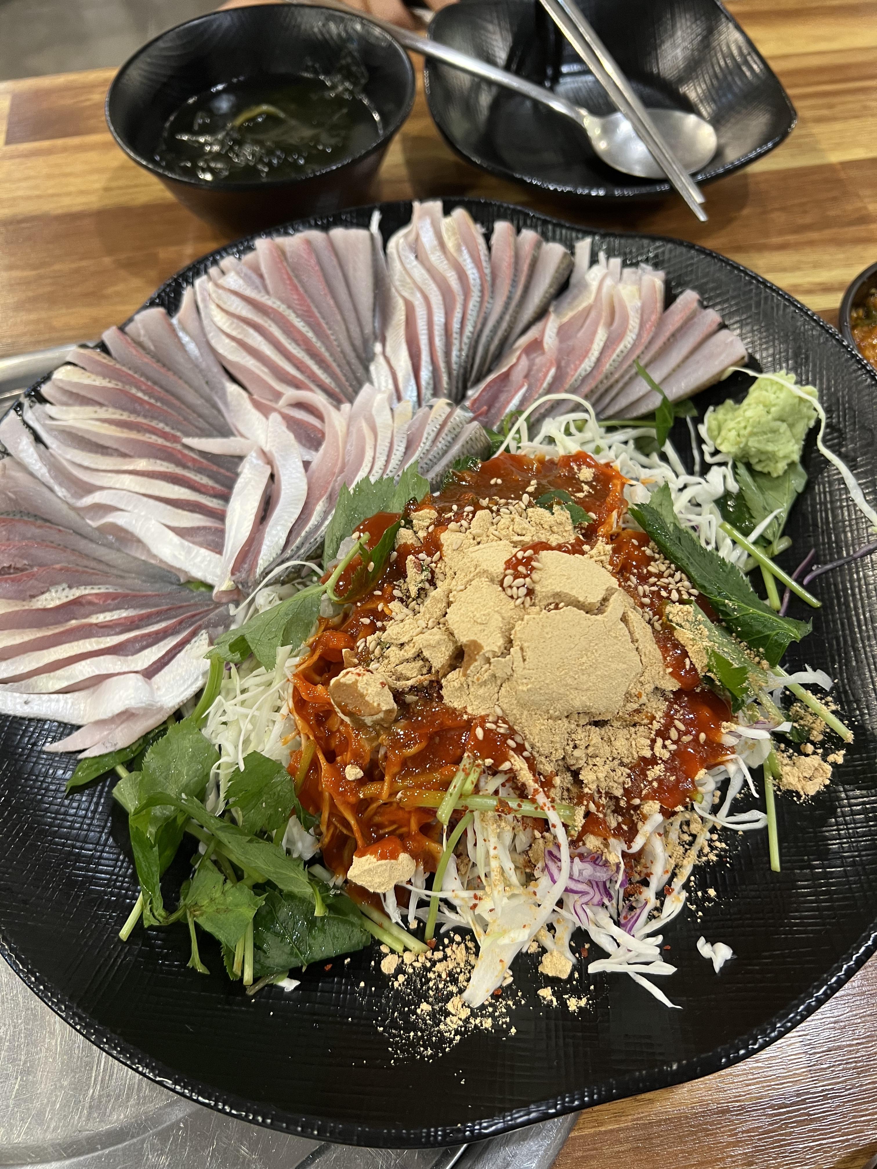 각종 야채와 양념에 콩가루 조합이 굉장히 특이했는데 전어와 정말 찰떡궁합이었습니다.
